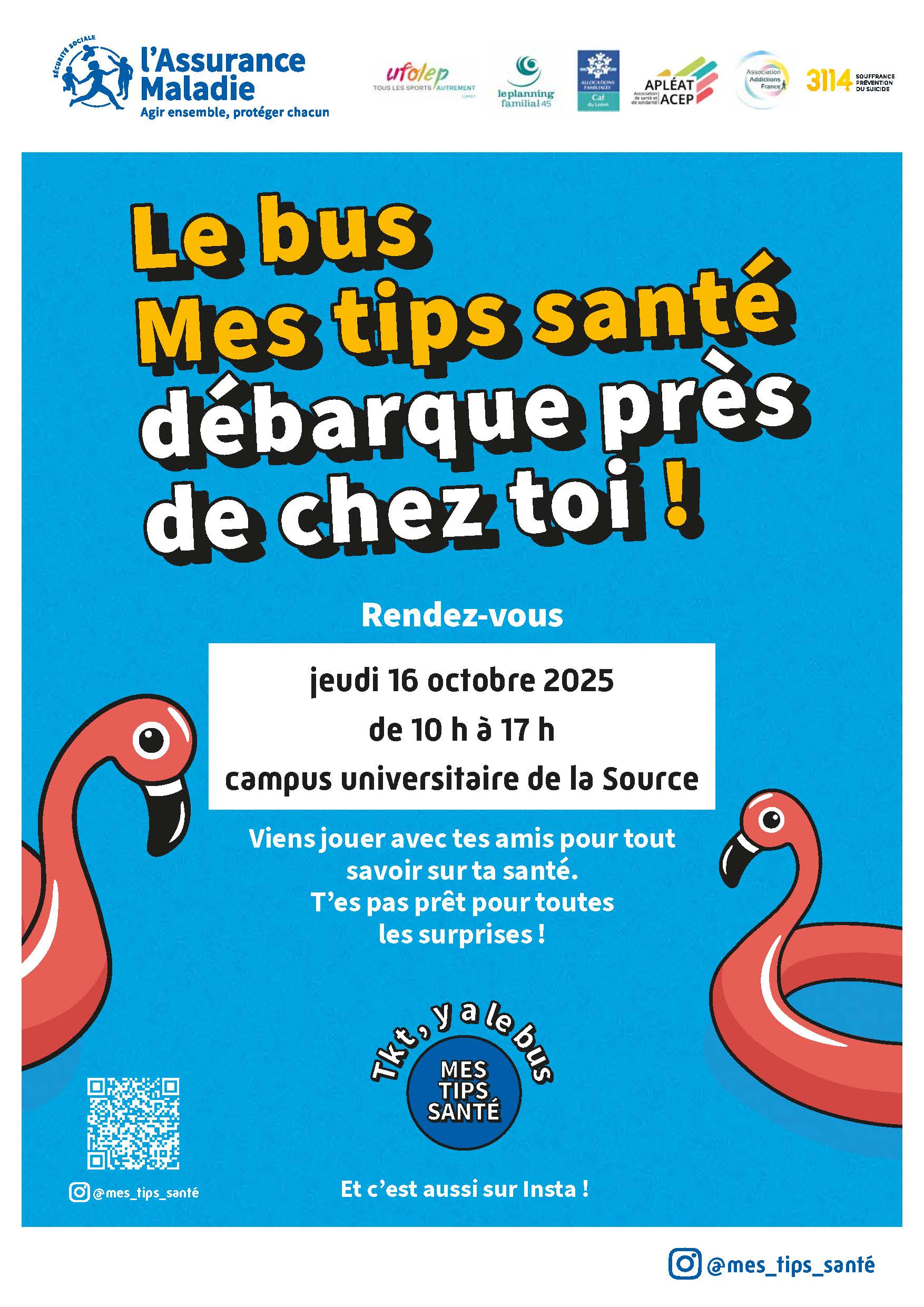Viens avec tes amis sur le campus universitaire de la source Contenu A savoir Dates 10 octobre 2025 Lieu Camping universitaire de la source à Orléans Catégorie(s) Santé Gratuit Oui D'autres évènements Tous les événements 21 septembre Marche gourmande santé Parcours pédestre gourmand et animation santé Santé Du 15 au 16 octobre Formation Premiers Secours en Santé Mentale Santé Du 12 mars au 02 avril Bougeons pour notre côlon Défi connecté - Qui fera le plus de pas ? Santé 04 mars Forum tout savoir sur le diabète Les clés pour mieux vivre avec la maladie Santé